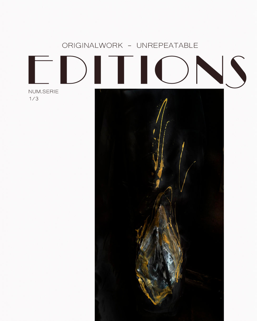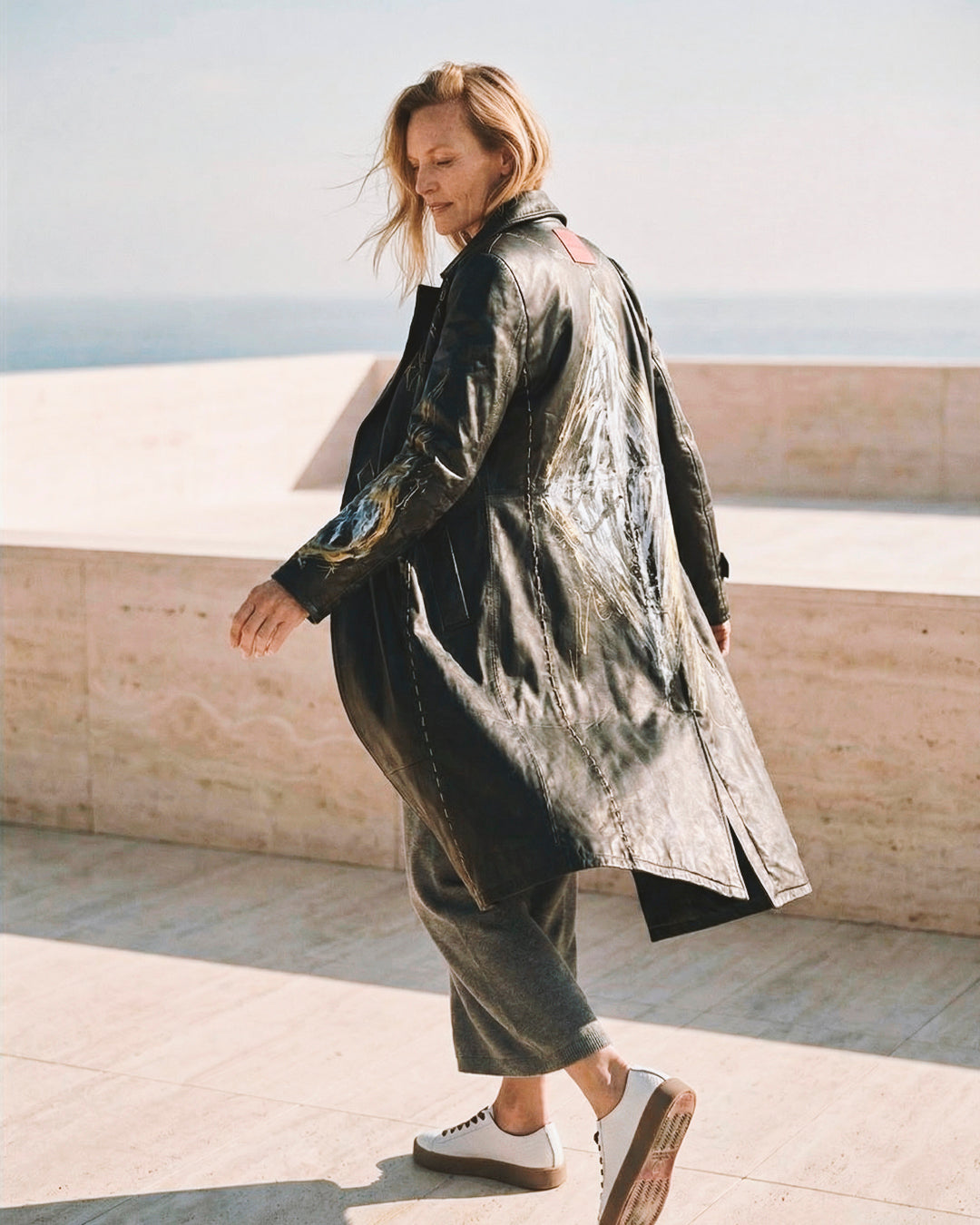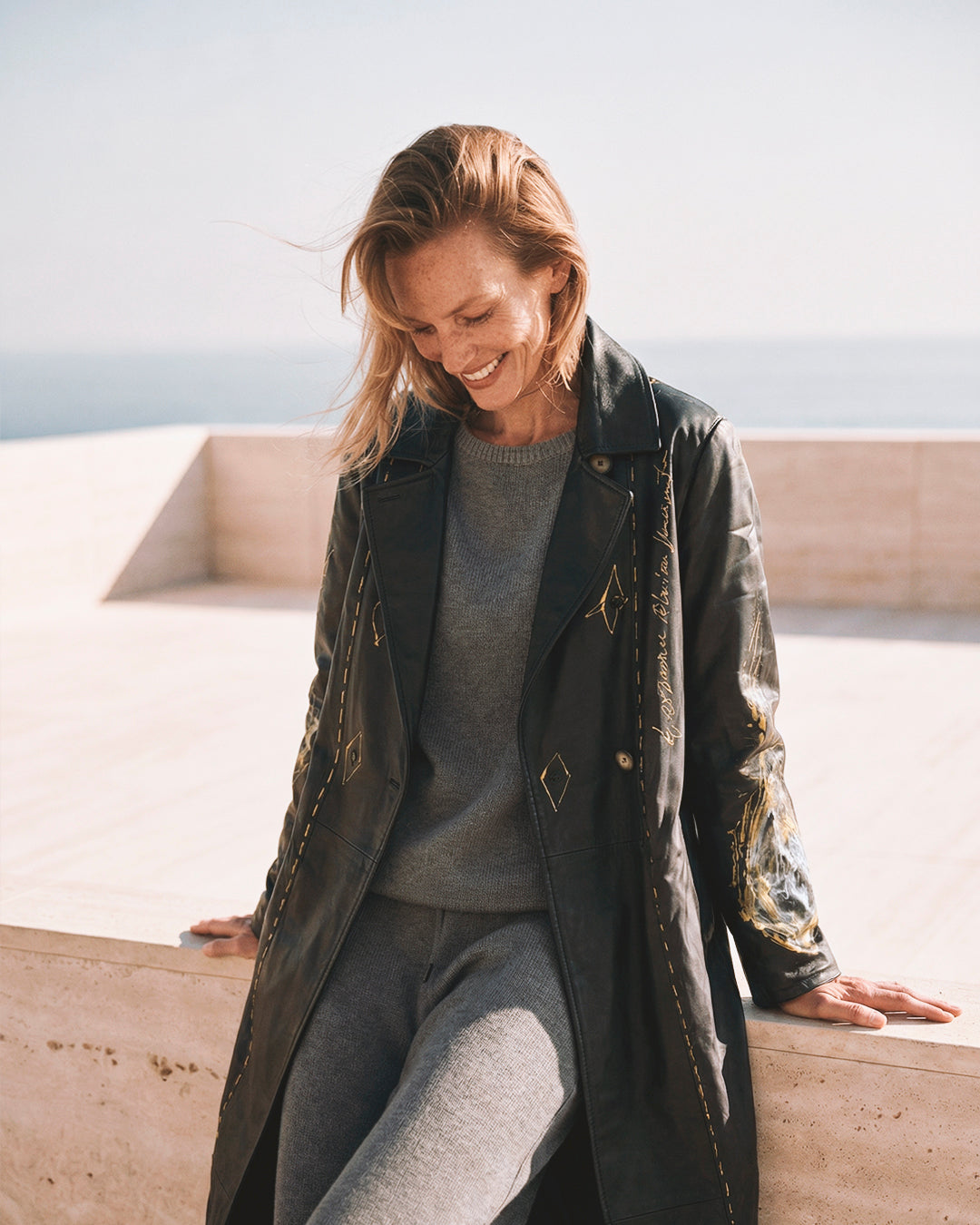 En contraste, el forro interior revela una obra pintada a mano por Cristina Casadevall, realizada directamente sobre la prenda. Cada intervención es única e irrepetible, transformando el interior del abrigo en un lienzo vivo. La pintura no se replica: cada pieza pertenece a una serie limitada y numerada dentro de EDITIONS.