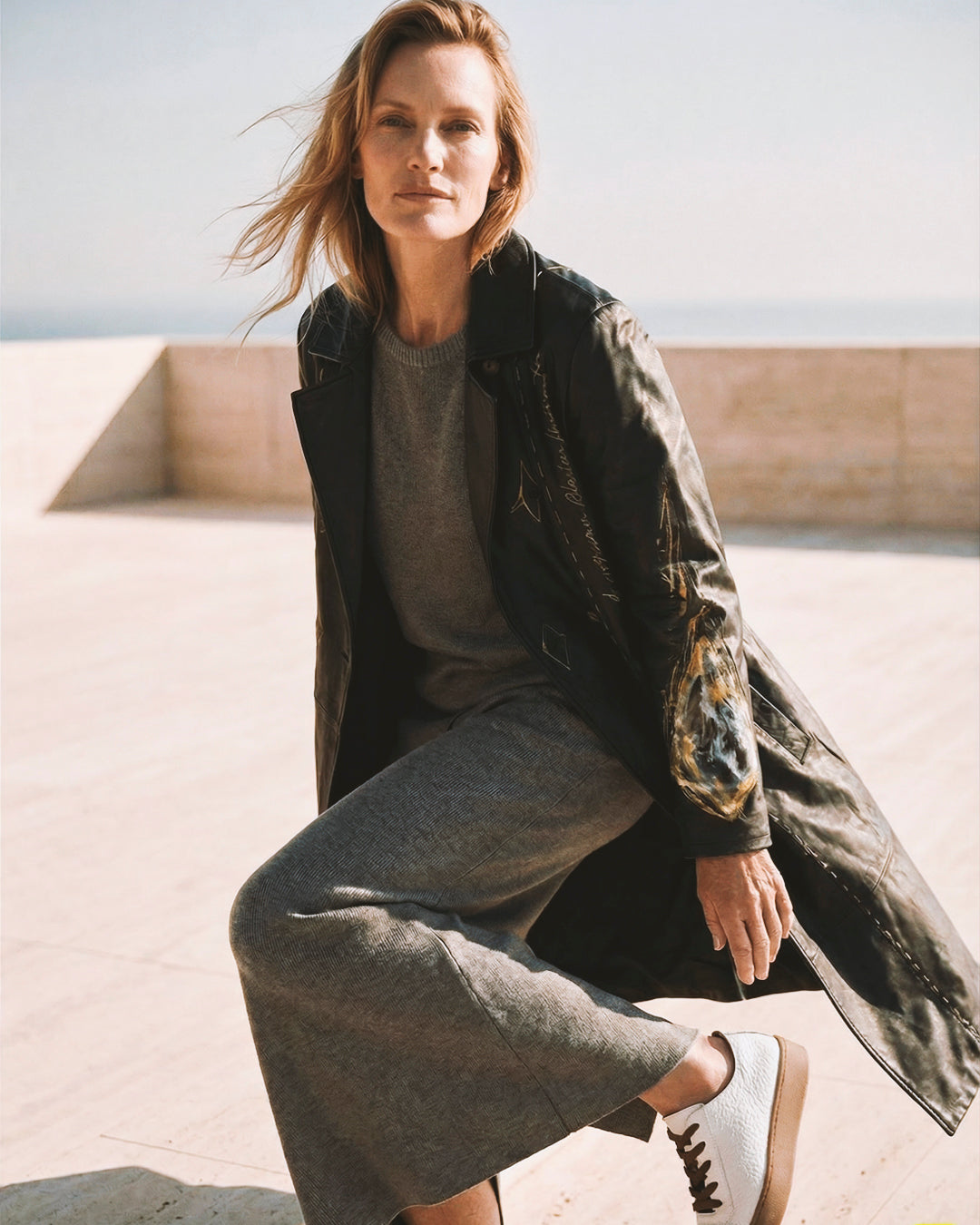 Este abrigo largo está confeccionado en piel de alta calidad, seleccionada por su textura, resistencia y caída natural. Su acabado exterior, limpio y depurado, presenta una presencia elegante y atemporal, pensada para integrarse con naturalidad en cualquier estilo.