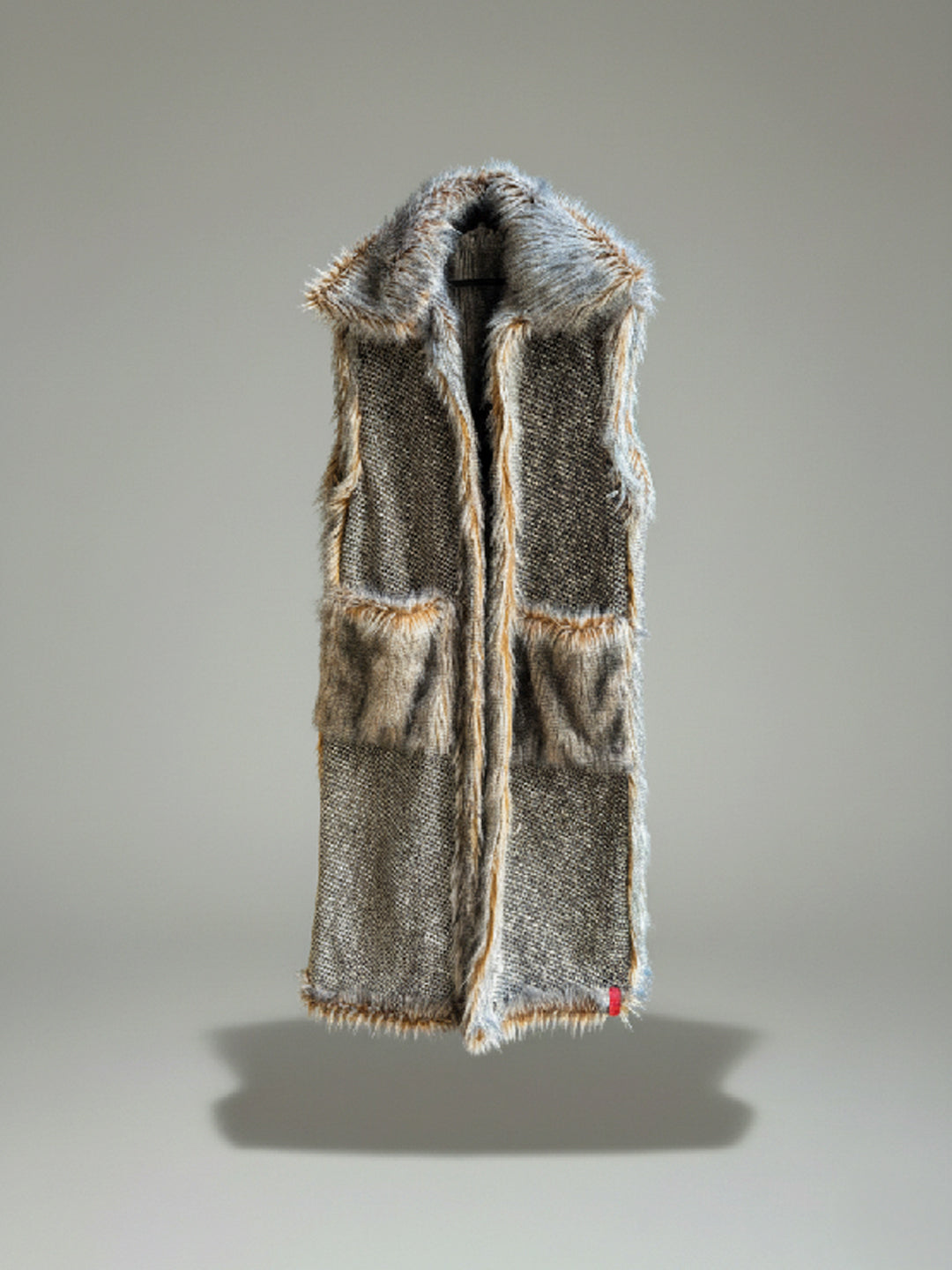 La textura del tejido, rica y con apariencia orgánica, evoca elementos naturales como la piedra o la tierra, convirtiendo esta prenda en una declaración de estilo y sensibilidad estética.