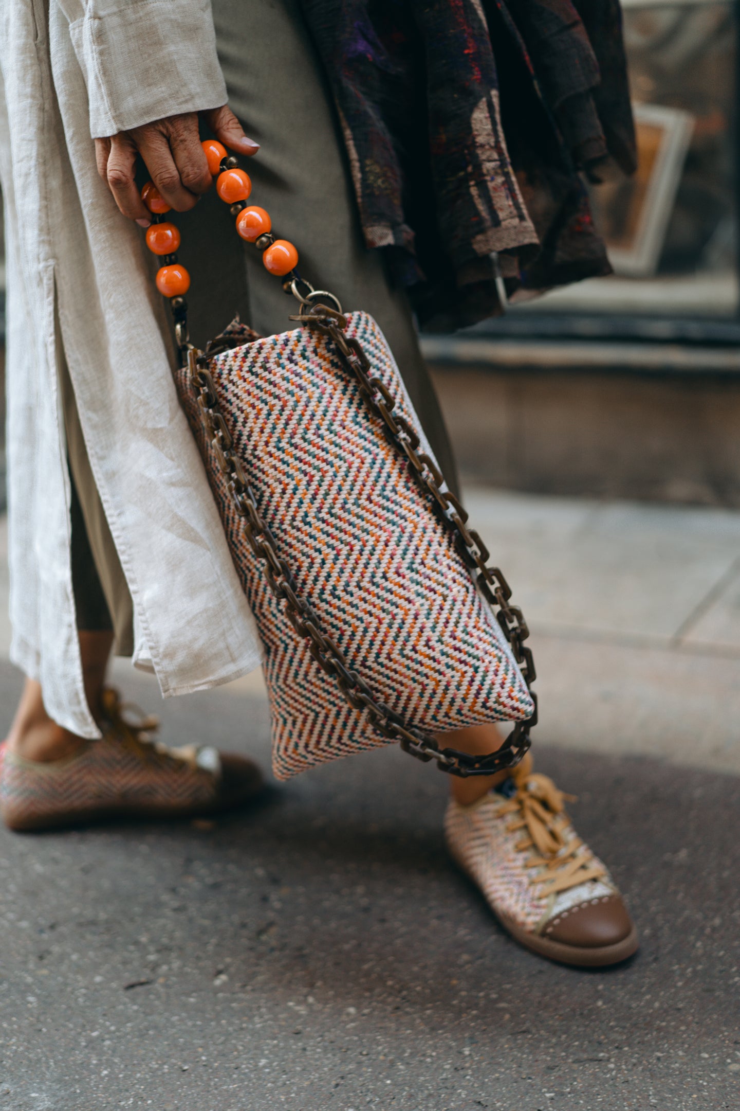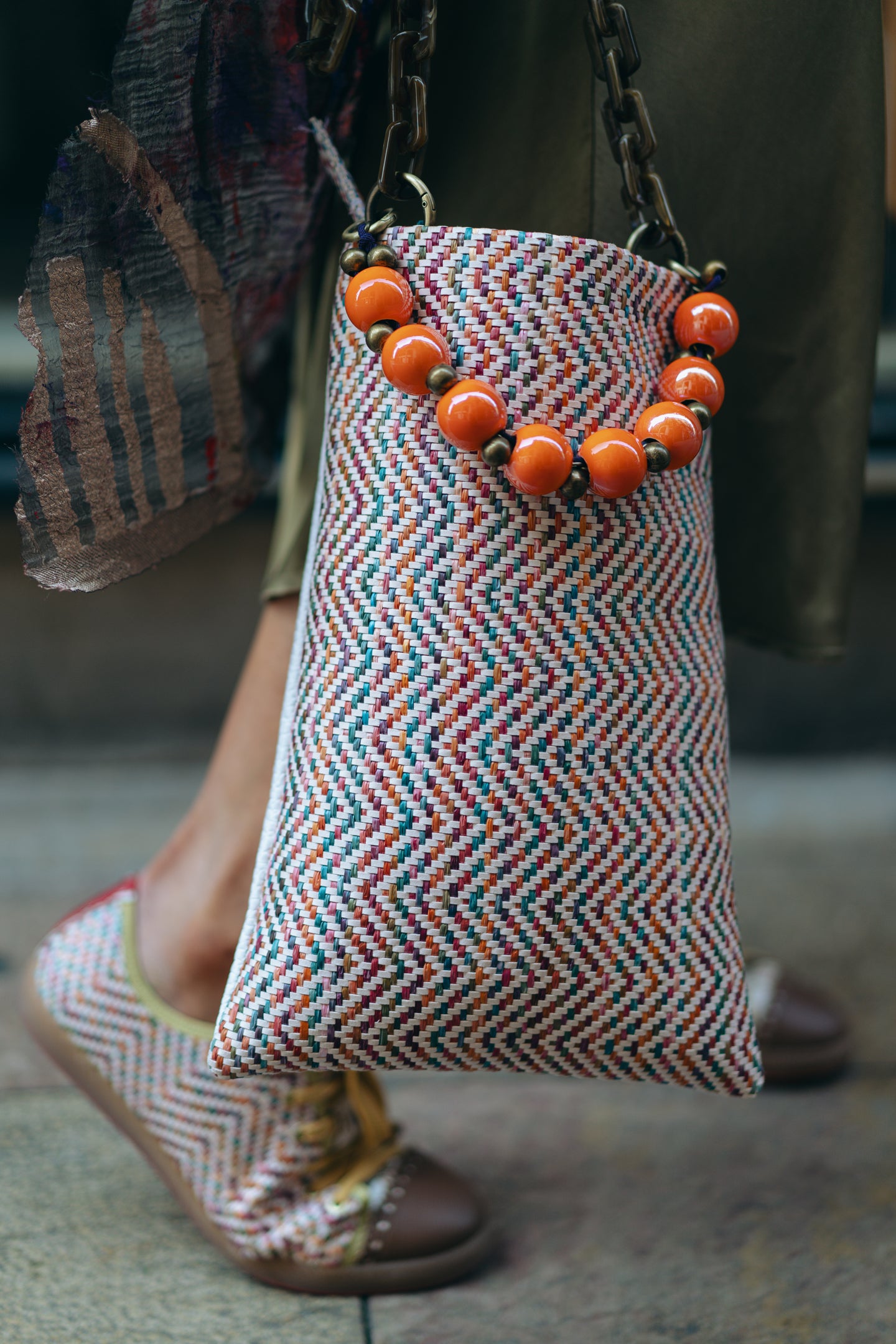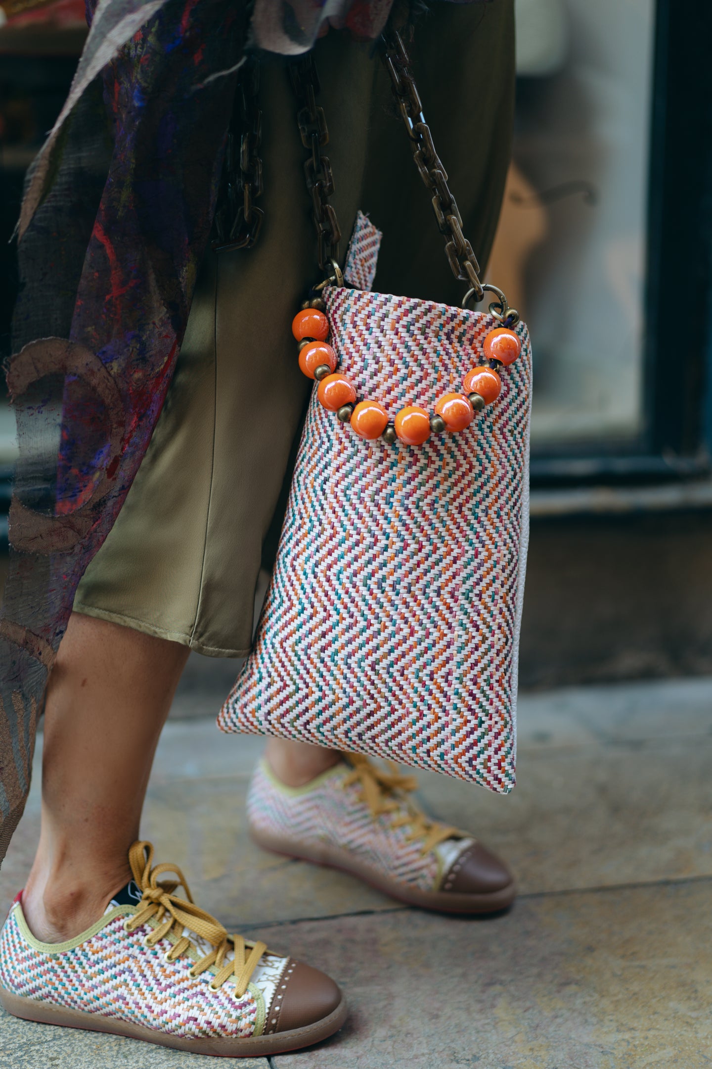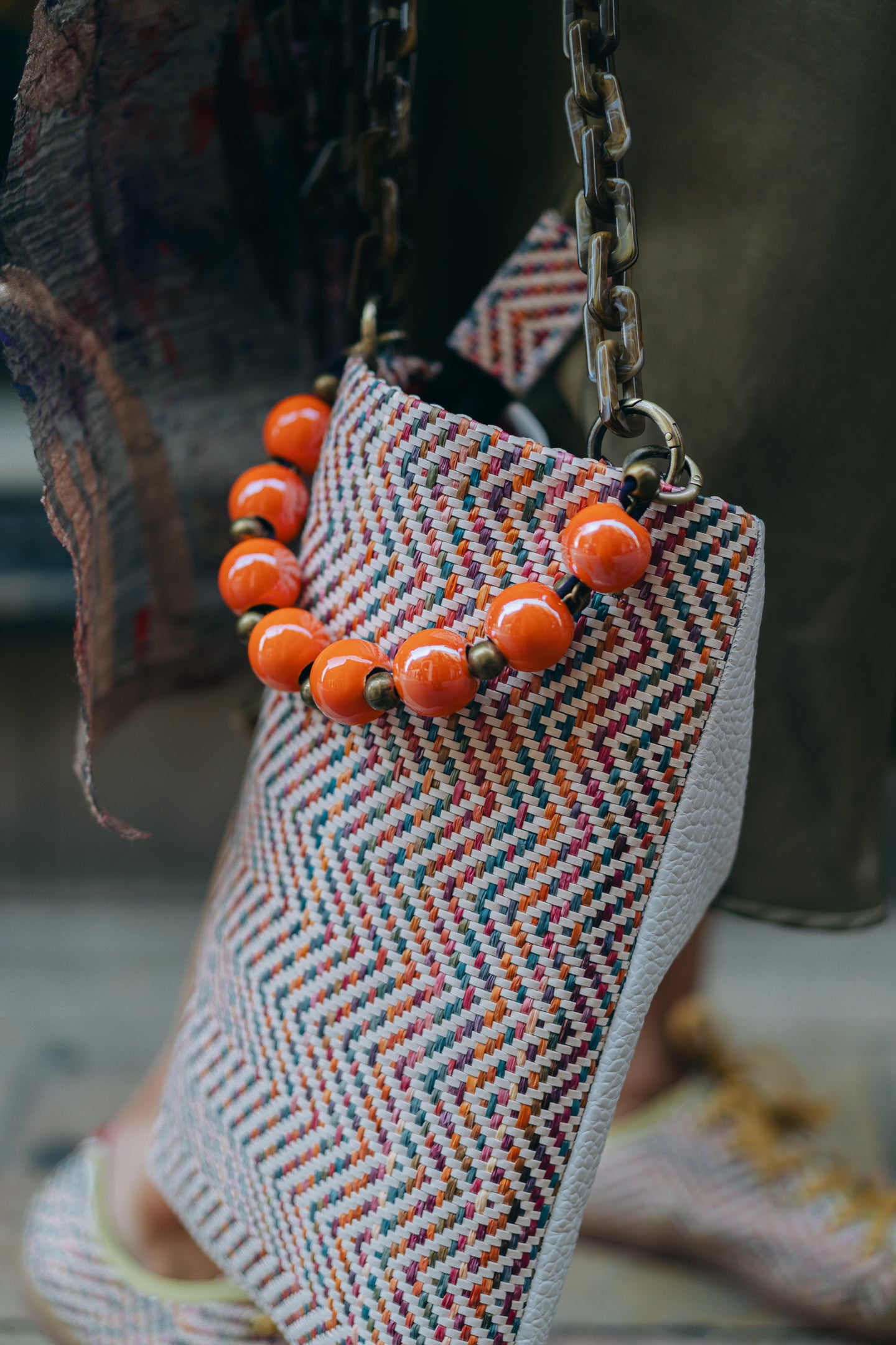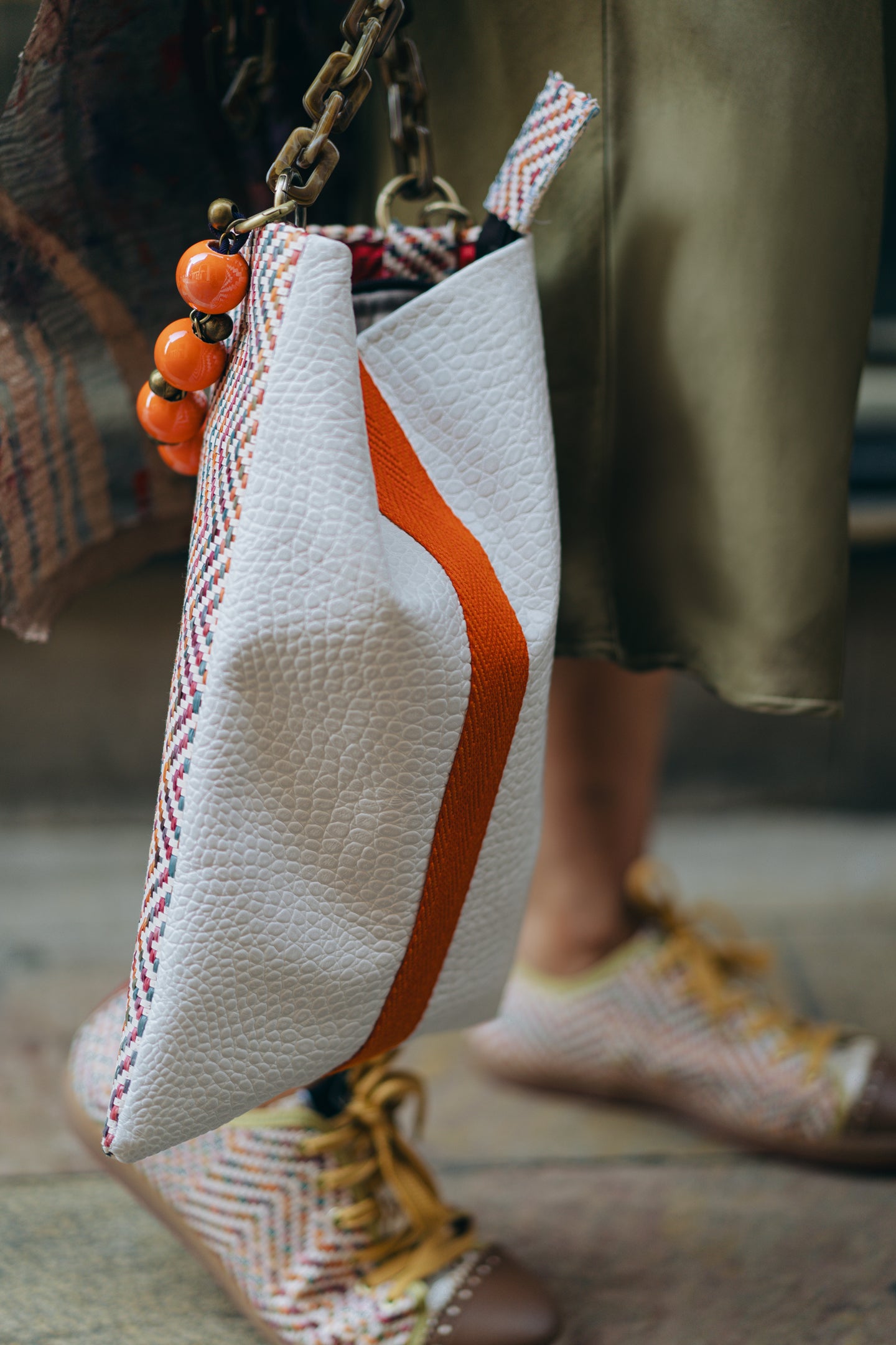 - Fabricado en nuestro trenzado italiano multicolor y en piel blanca grabada (a juego con los modelos Sneaky Treccia Caramelo y Ayre Caimano).