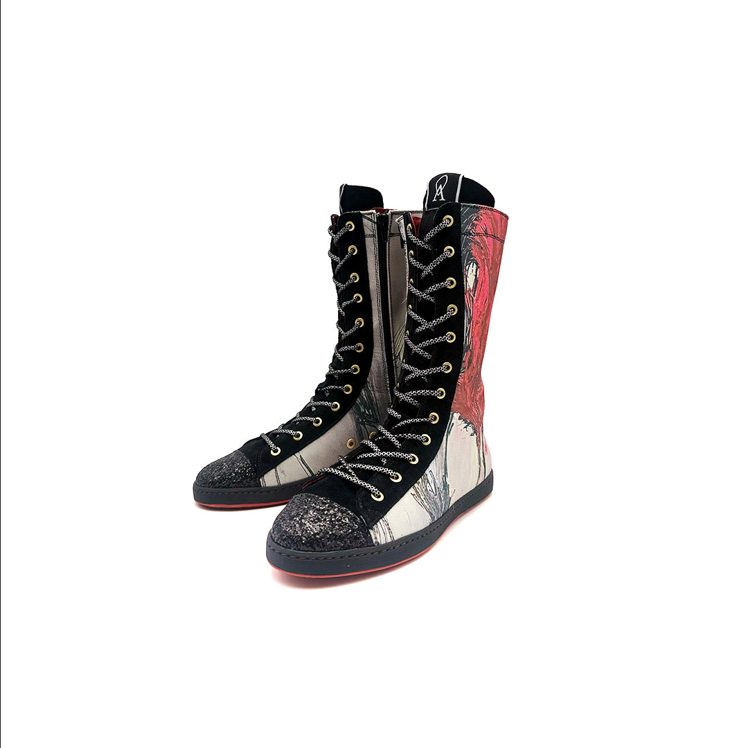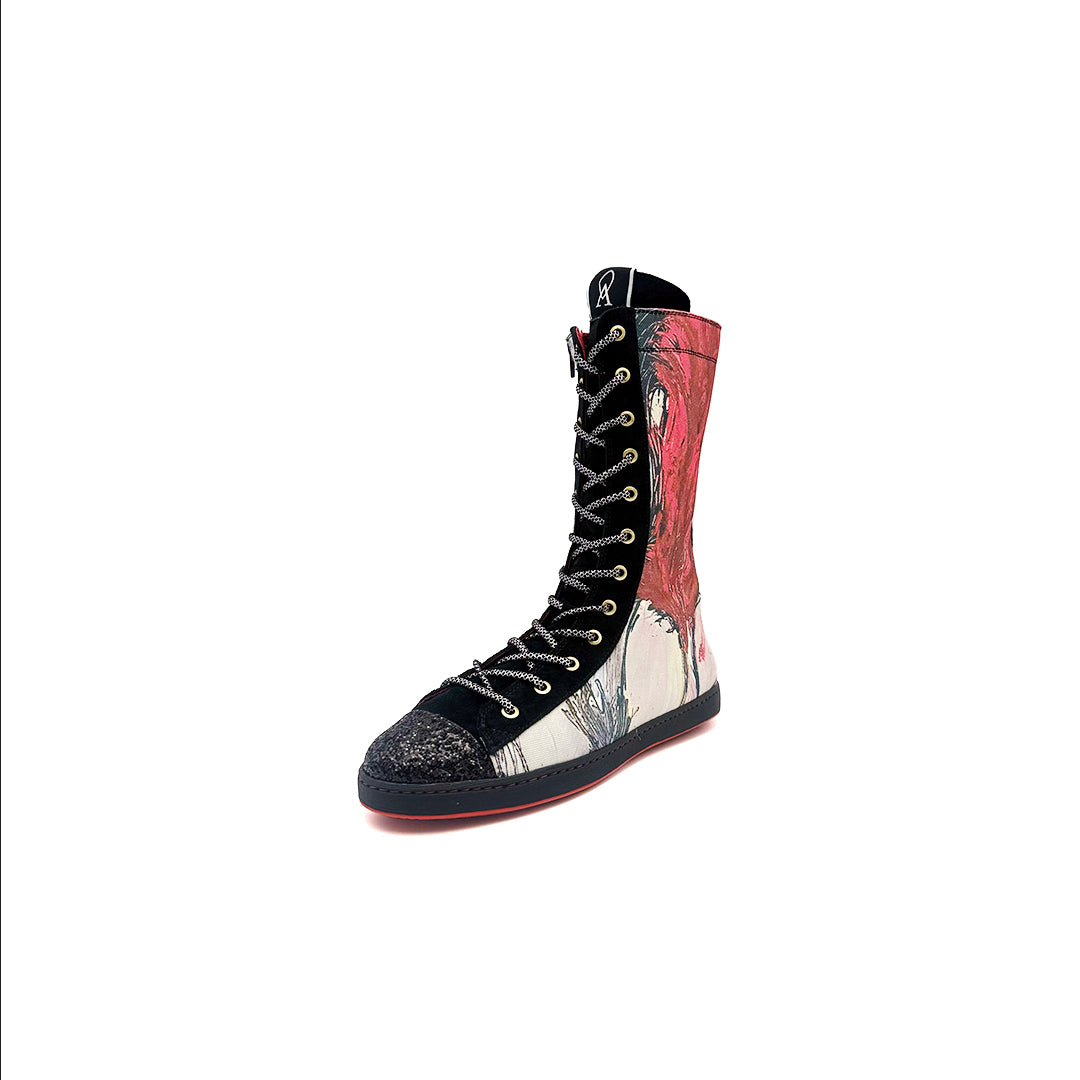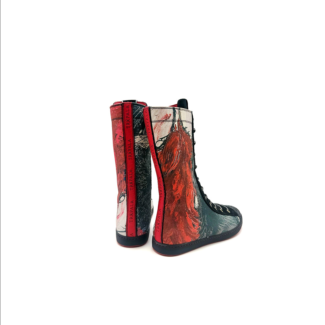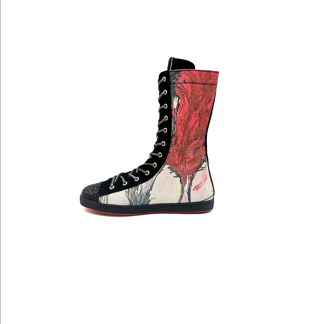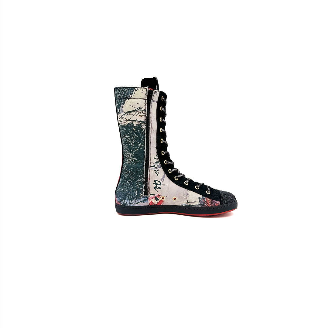- Hechas de serraje natural en color negro (subproducto procedente de la industria alimentaria) y trazos de obras de arte seleccionadas y trabajadas de forma digital sobre textil para poder garantizar una mayor durabilidad.
