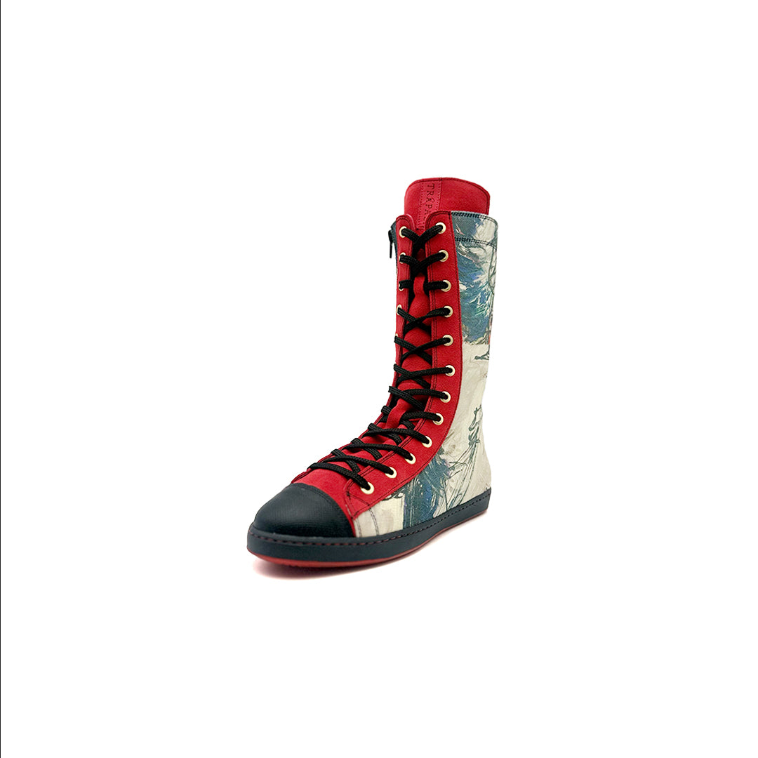- Hechas de serraje natural en color rojo y trazos de obras de arte seleccionadas y trabajadas de forma digital sobre textil para poder garantizar una mayor durabilidad.