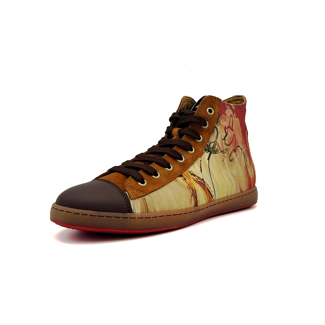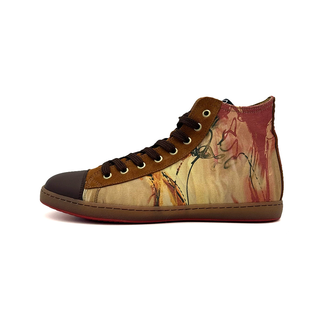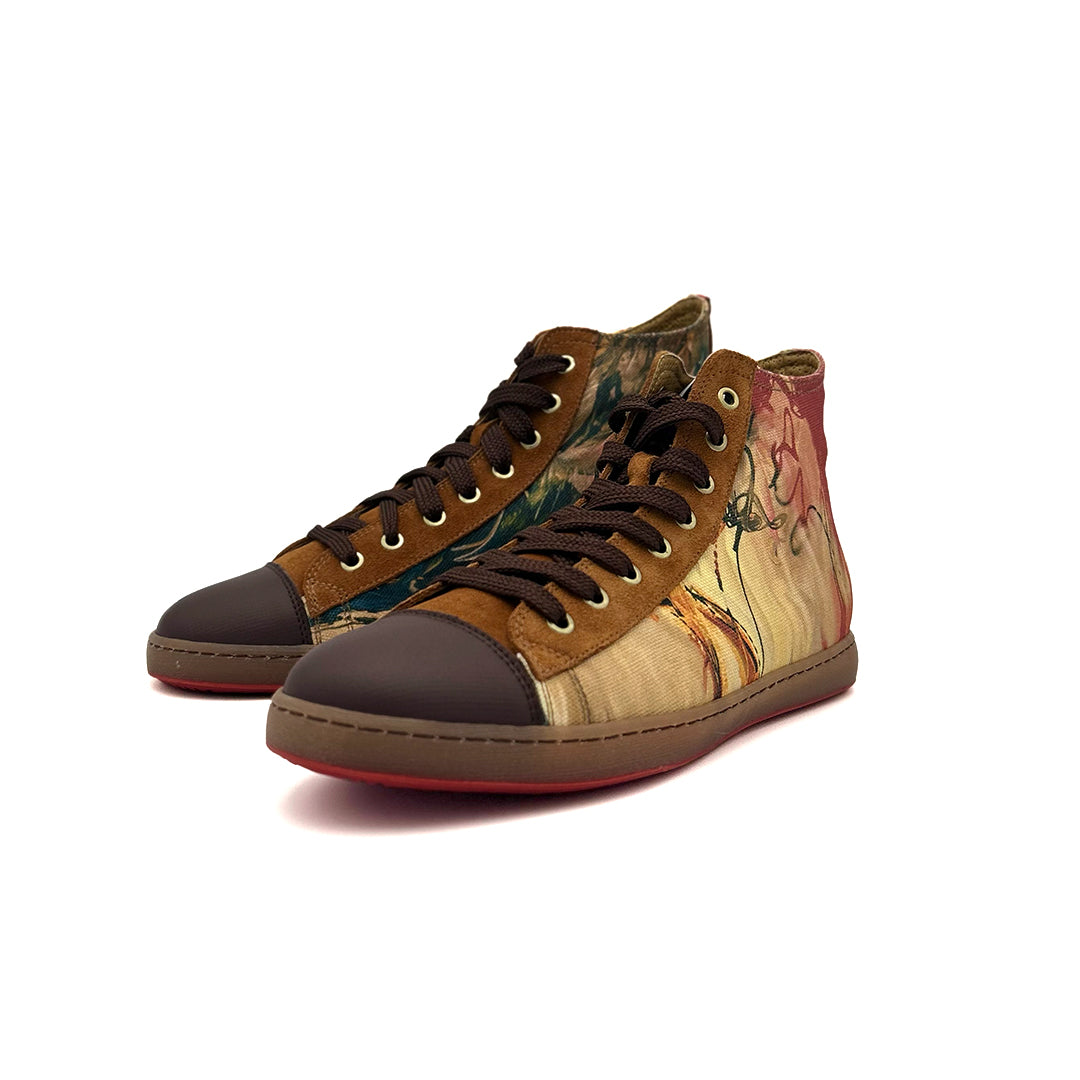 - Hechas de serraje natural en color setter (subproducto procedente de la industria alimentaria) y trazos de obras de arte seleccionadas y trabajadas de forma digital sobre textil para poder garantizar una mayor durabilidad.
