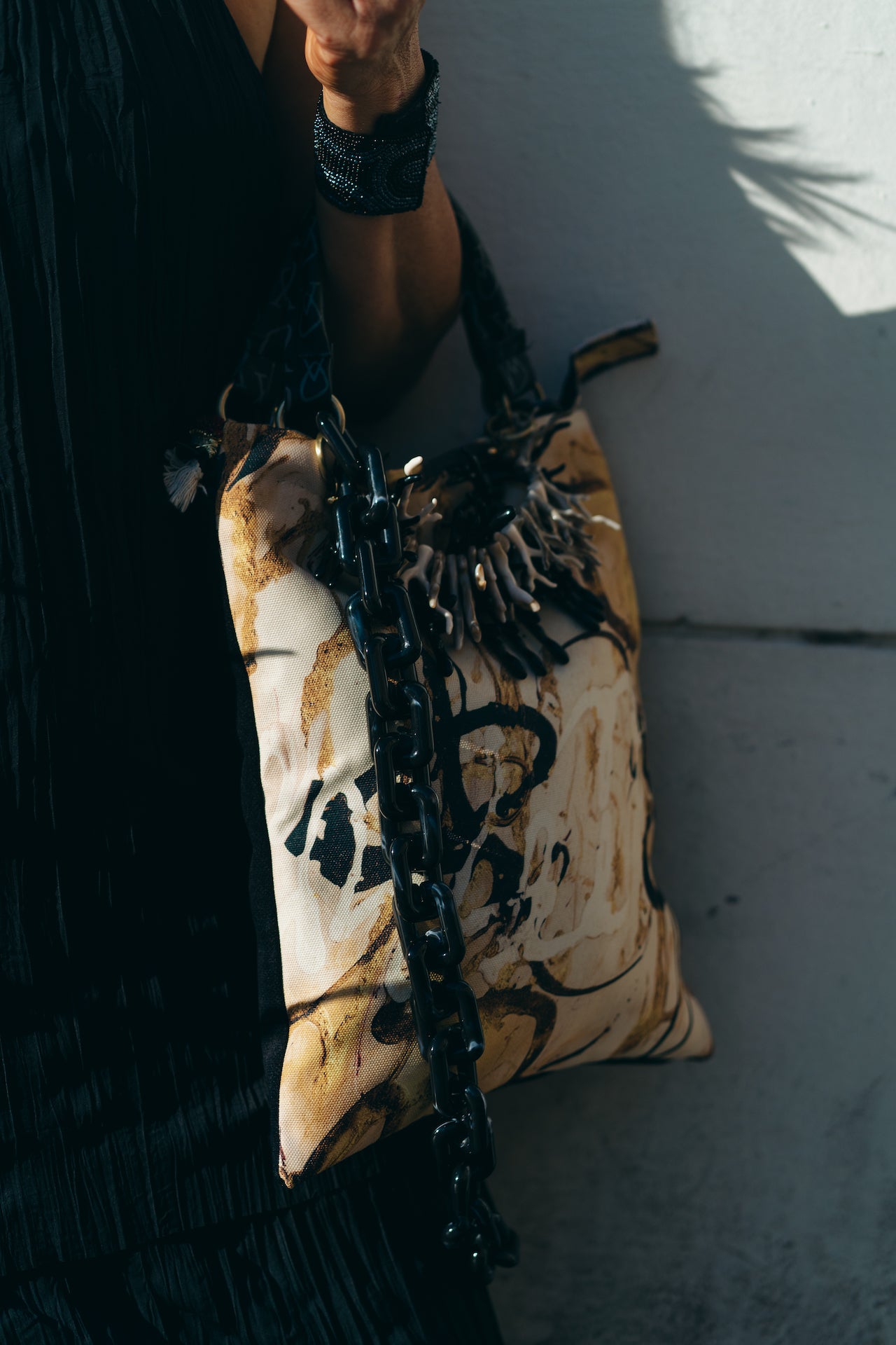 - Fabricado en textil a partir de los trazos de la obra de Casadevall (a juego con nuestro Zueco Bianconero) y en chenilla negra.