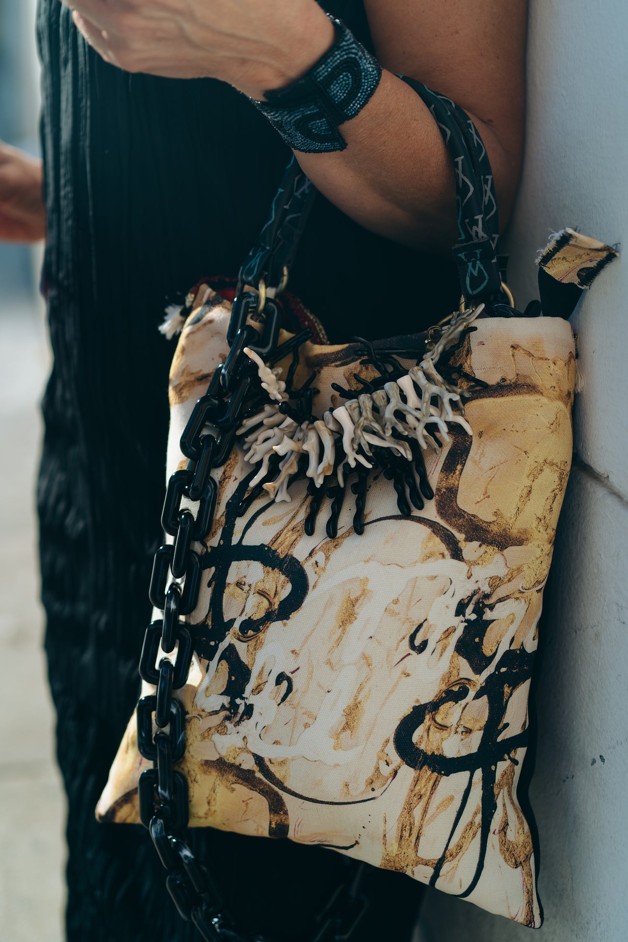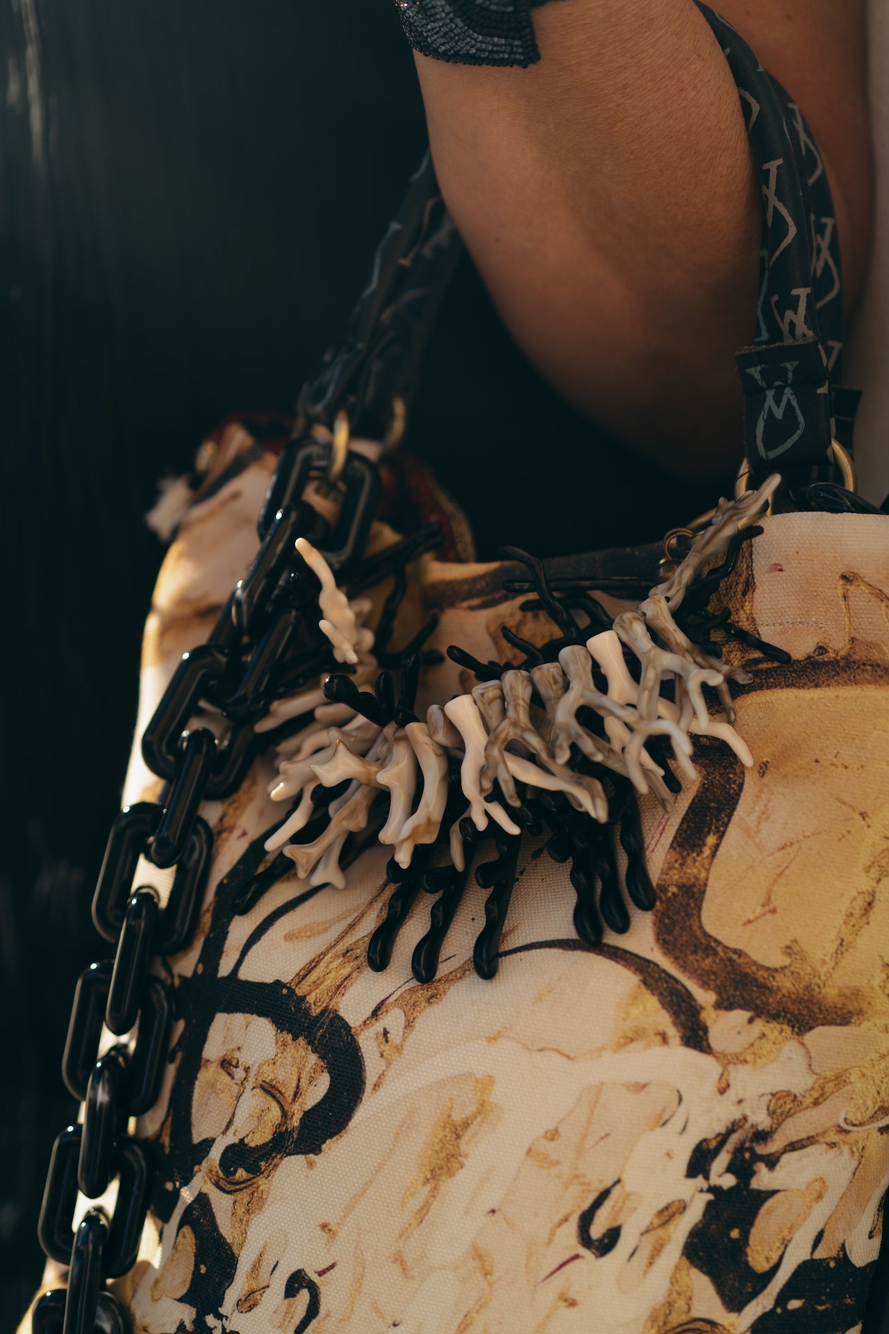 - Cadena negra fabricada en material acrílico para colgar al hombro.