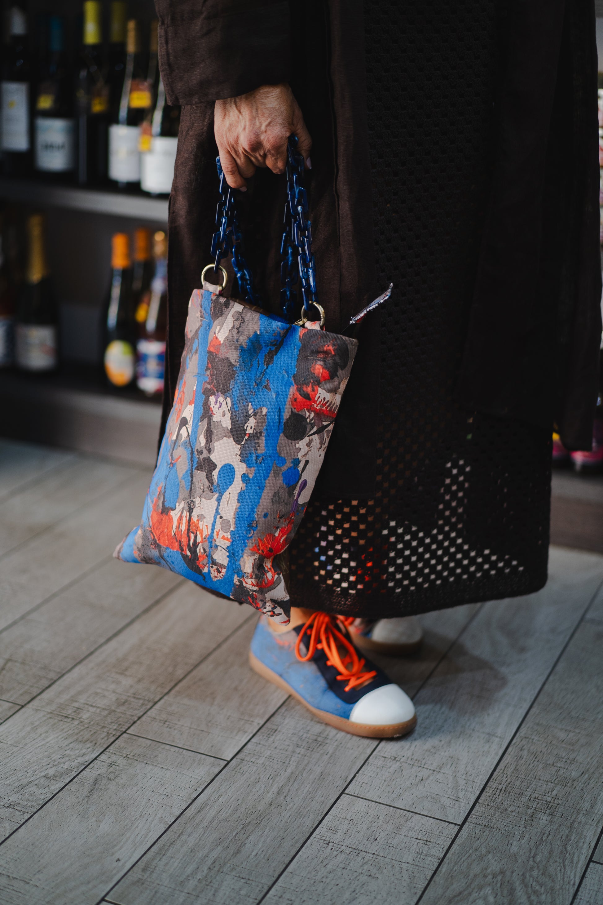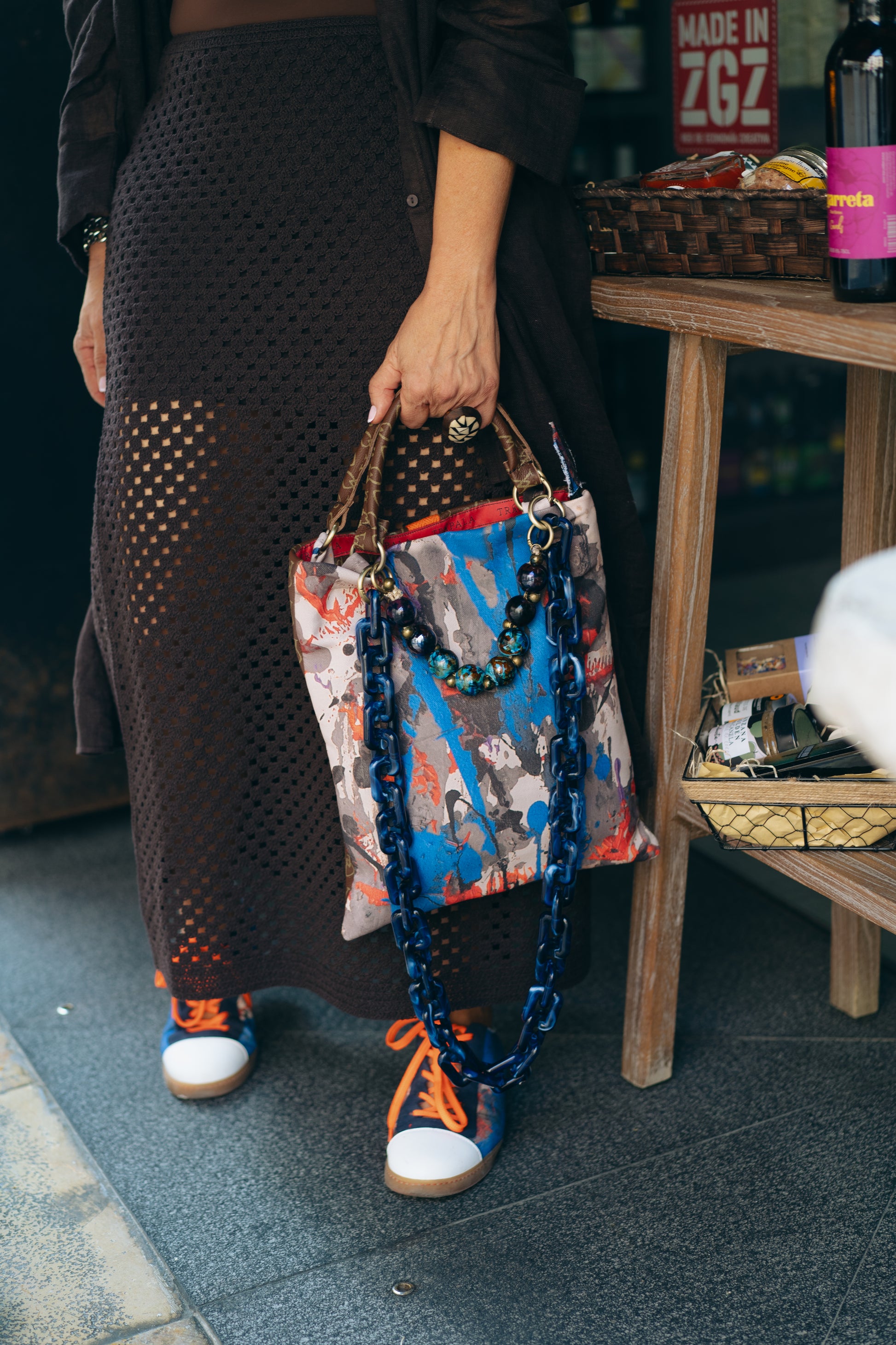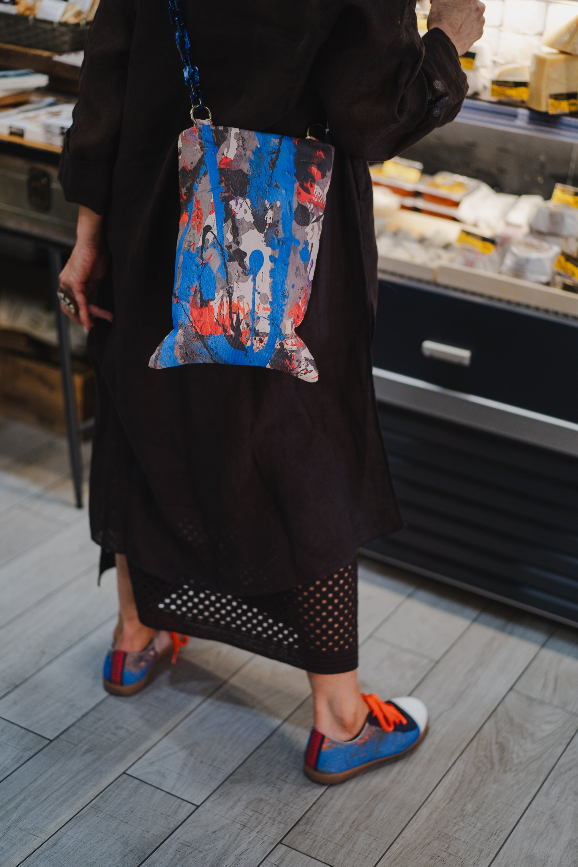 - Hechas de serraje natural en color azul (subproducto procedente de la industria alimentaria) y en material textil a partir de trazos procedentes de la obra original de Casadevall.