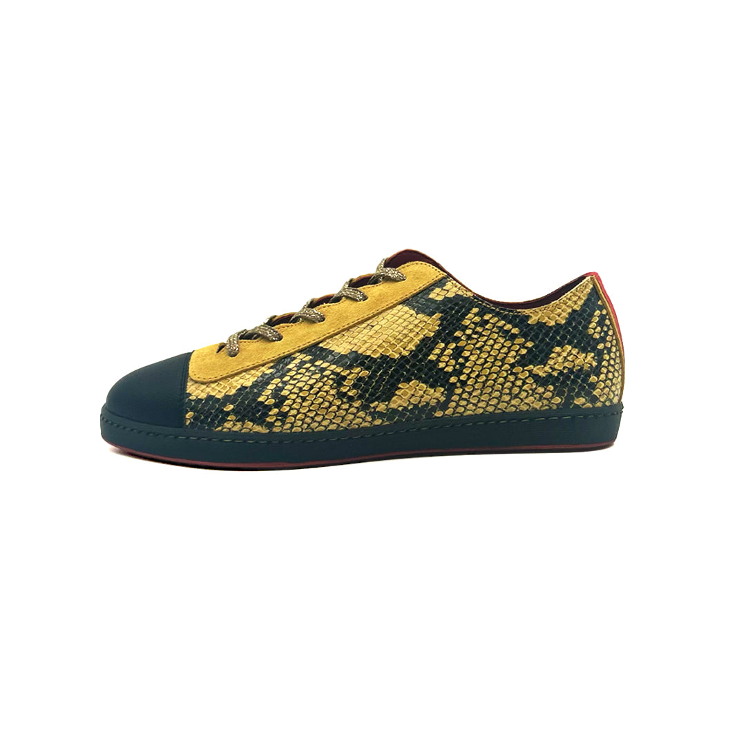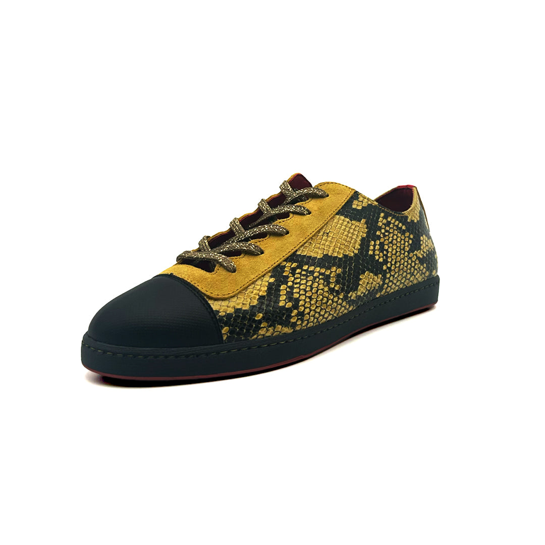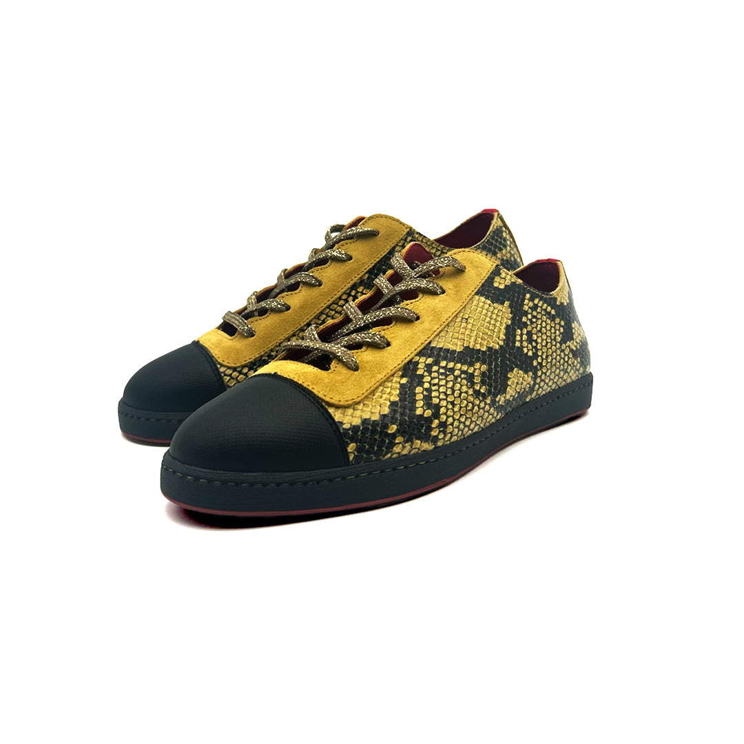 - Hechas de piel tipo pitón en colores negro y amarillo.
