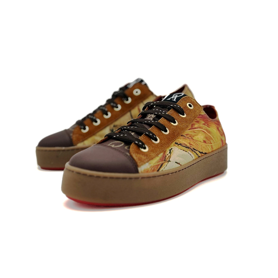 - Diseñadas a base de trazos y hechas de serraje natural en color café (subproducto procedente de la industria alimentaria) y en piel multicolor de la mejor calidad.